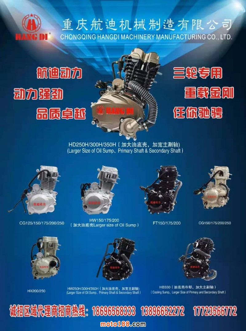 【重慶航迪機械制造有限公司】專業生產摩托車二、三輪專用發動機,航迪動力,重載金剛,雙冷雙濾,動力強勁、品質卓越。誠招區域代理商及外貿客商!招商熱線:17723566772、19922959937、023-47632168。