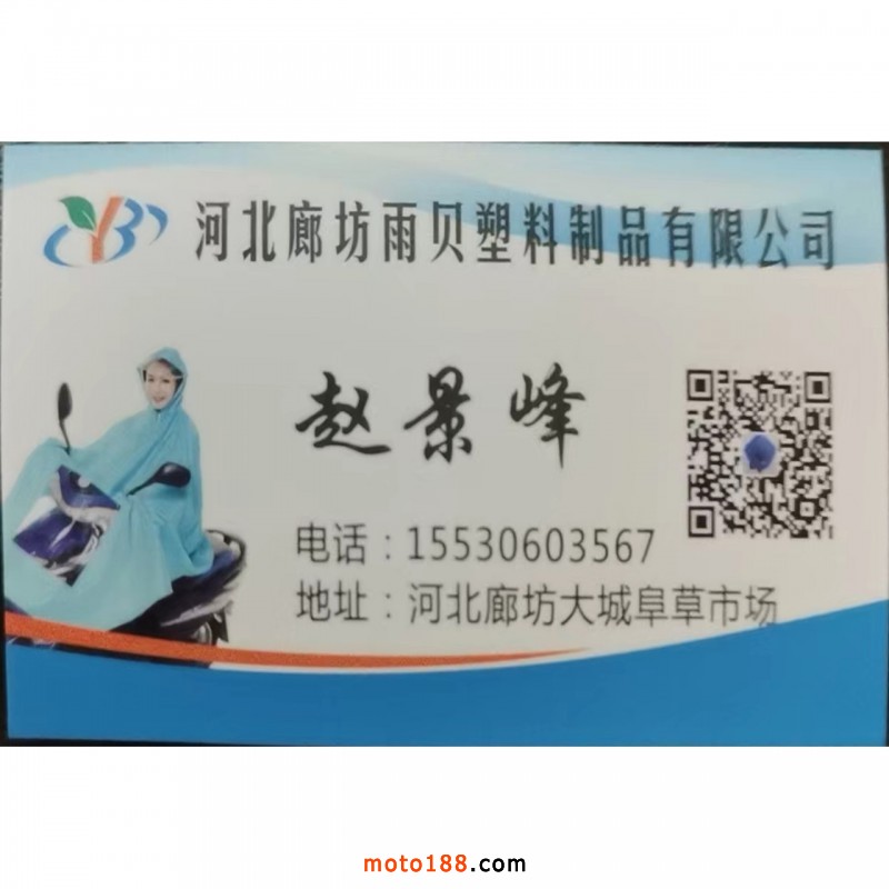 河北廊坊雨貝塑料制品有限公司,專業生產牛津布、摩托車電動車車罩、雨衣、雨披系列;顏色多樣,熱封膠帶燙縫,百分百不漏水,可來樣加工定做。聯系方式:15530603567