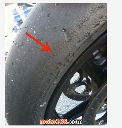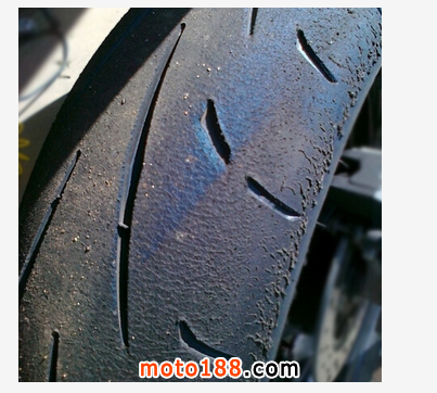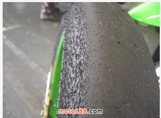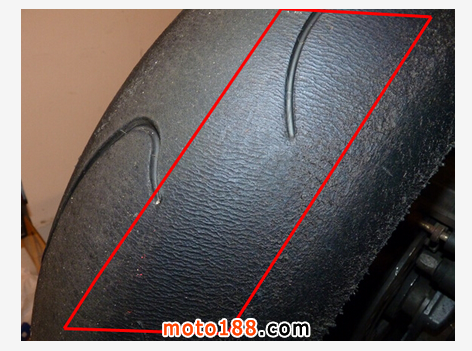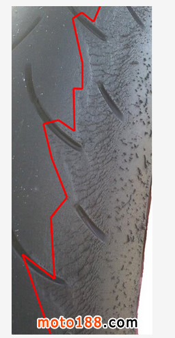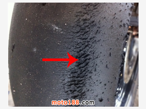 圖上這種狀況是前胎變形量不足,通常是前胎的負(fù)荷太小或是錯(cuò)誤騎姿造成。負(fù)荷太小另一個(gè)結(jié)果就是溫度上不來,輪胎無法維持在工作溫度。