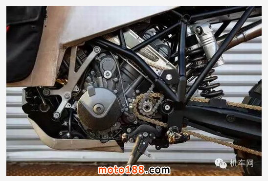 該車架被改造,以適應(yīng)改造后的全鋁車身,包括一個(gè)巨大的12加侖的油箱。在發(fā)動(dòng)機(jī)出口方面,我們正在尋找一個(gè)手工制作的不銹鋼排氣管。