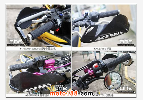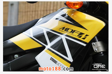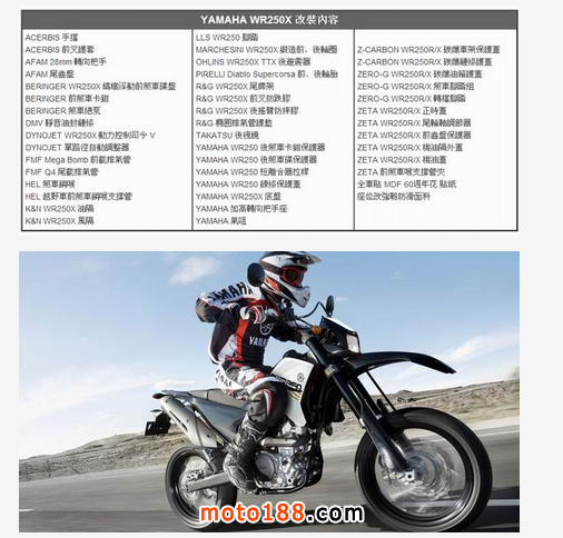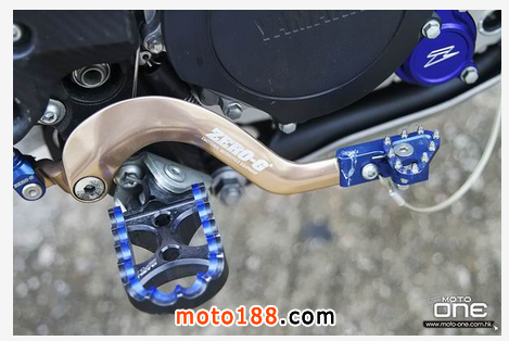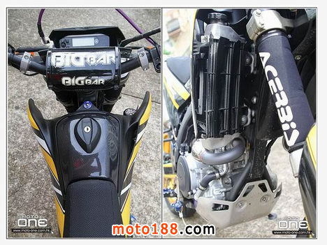 首先全車貼上MDF YAMAHA 60周年經典拉花貼紙,外觀鮮明而突出,加上車主放棄了原廠的鋼絲輪框,選用了輕巧優質的MARCHESINI前、後鍛造輪圈,令這supermotard更具街車的風格。與此同時,前制動用上法國的BERINGER鑄鐵浮動前煞車碟盤、前煞車卡鉗、煞車總泵等組合,制動效能明顯更優於原廠。全車還有?HLINS TTX 後避震器、FMF 排氣管、AFAM 28mm 轉向把手、尾齒盤及繁多的改裝部件,令此YAMAHA WR250X呈現更佳的制動力、操控性、舒適感及美觀度。而詳盡的改裝清單可看以下的「YAMAHA WR250X 改裝內容」,一目了然。
