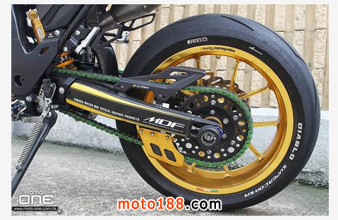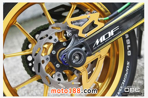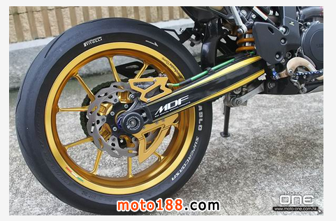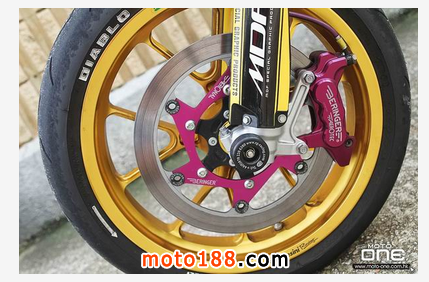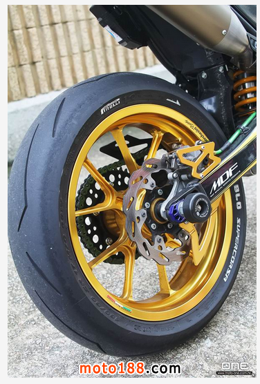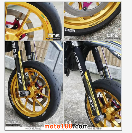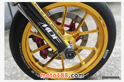 ●原廠的鋼絲輪框,改用了金色的MARCHESINI WR250X 鍛造前、後輪圈,輕巧強硬,更有利操控。