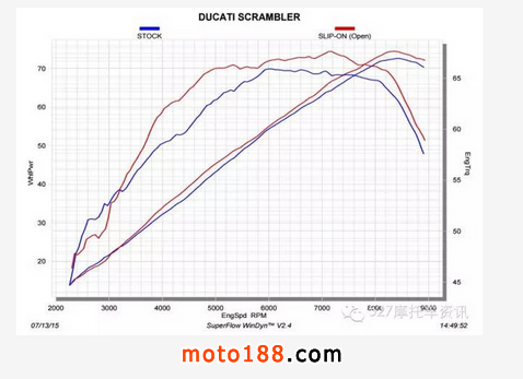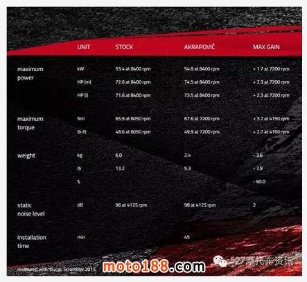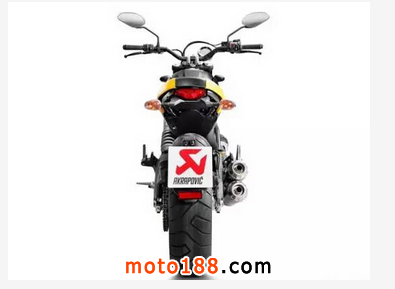 全新的Akrapovi?尾段排氣由優質鈦合金制成,采用MotoGP賽車的雙錐管設計,再搭配上啞光黑的外管,使其外觀看上去更加與眾不同;與杜卡迪原裝排氣相比,Akrapovi?排氣的聲浪更加渾厚有力,但排氣的噪聲級也從96分貝(4125轉)增加到98分貝(4125轉),不過Akrapovi?消音器已通過ECE和EC的合規性測試,所以騎士大可不必擔心噪音帶來的困擾;除聲浪的變化外,Akrapovi?排氣采用的競技用材料能使排氣管的重量從6kg減輕到2.4kg,相當于減重60%,真正做到了極致輕量化;另外,裝上Akrapovi?排氣的Scrambler會有2.3匹(7200轉)的馬力提升和3.7牛米(4150轉)的扭矩提升,使摩托車在性能上也有了一定的提高。