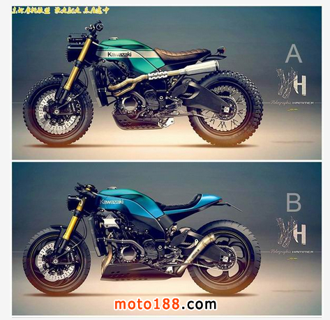 Sylvain Berneron的最新作品,是由KAWASAKI ZX-10R改裝的SCRAMBLER。原裝ZX-10R是近年熱門SUPERBIKE,并即將在頂級WSBK賽事中稱霸,原裝車是披上大包圍及采用前後17寸輪框的超級跑車,但手繪版看來只保留車架、尾擔、前叉、煞車卡鉗及引擎等部件。手繪作品則換來裸露車身,加裝了防撞肚兜、前後越野菠蘿胎、鐵絲網保護大燈及典型SCRAMBLER風格的超高排氣管。