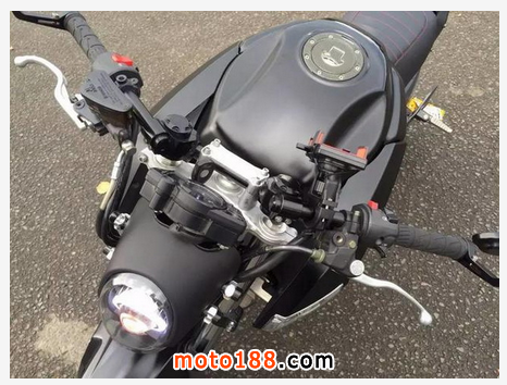 剩下就是一些小的改裝,原本的手把太簡單,所以改了分離手把,又因為還要偶爾長途,所以手機支架是必不可少的。后視鏡也改了,手把后視鏡更符合這種復古戰斗感覺。原來的下導流罩太靠后,完全不符合戰斗感,所以導流罩我也往前移動了8厘米。