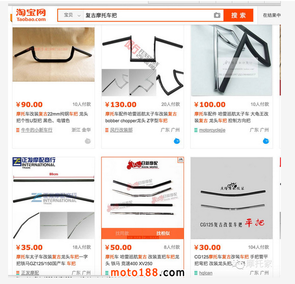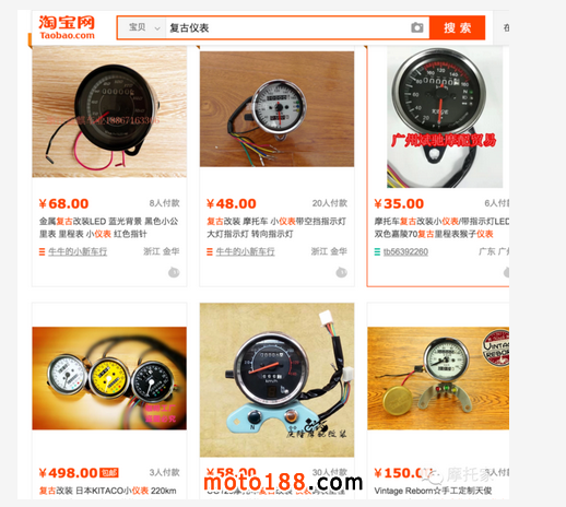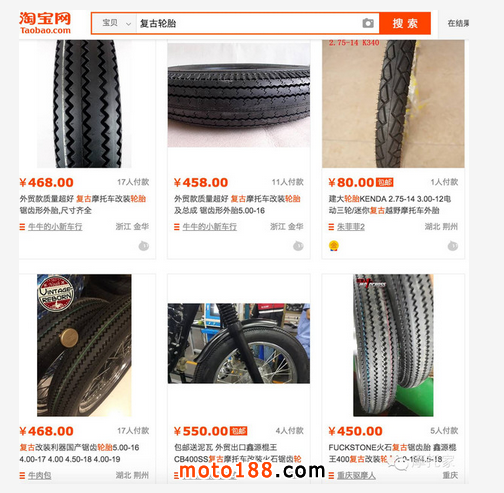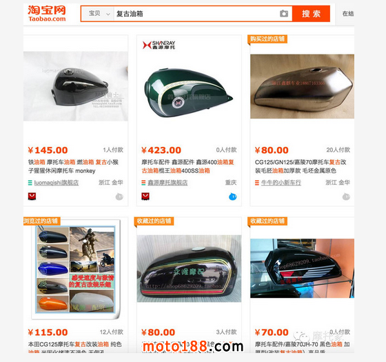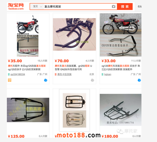 圖上大大用箭頭標出來的地方就是復古摩托改裝一般都會改裝的部分。這些改裝配件都可以通過淘寶購的(感謝馬云大大~)。所以我們以開頭那臺車為例子,看如何采購配件,來打造一臺和原型車八桿子打不著的復古摩托車!