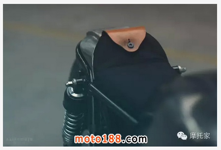 值得一提的還有專門制作的頭燈蒙罩。同樣是由真皮和單寧制作,前方留有矩形開口。點亮時,開口縫隙射出一道被塑形過的光源,猶如獨眼巨獸的惡魔之眼,超級有型,據說靈感來自BMW的 Zündapps。如此討巧有創意的設計非常值得借鑒。