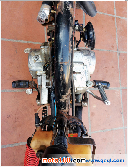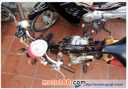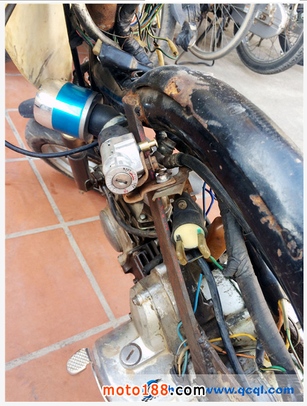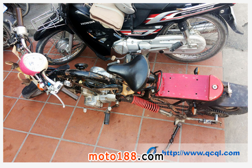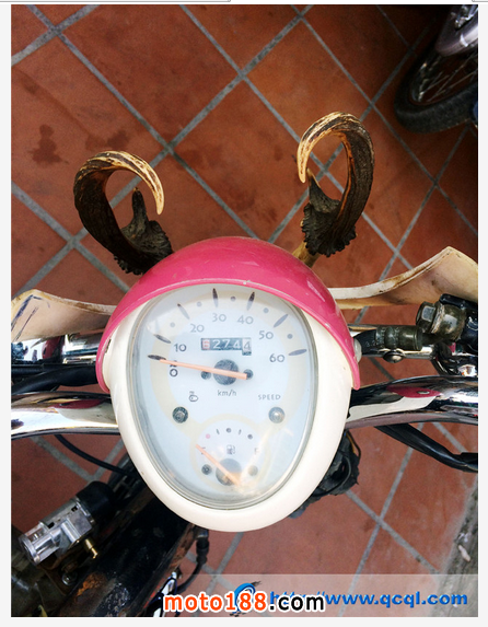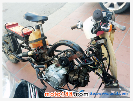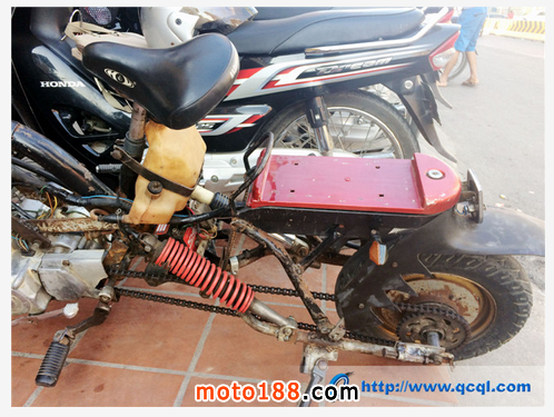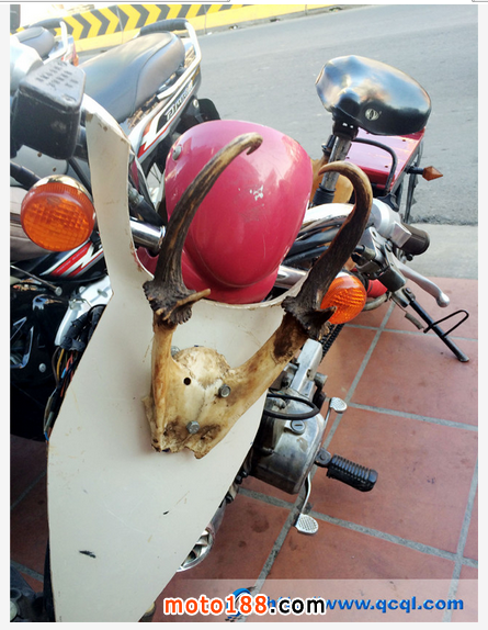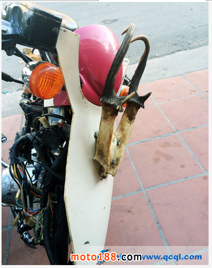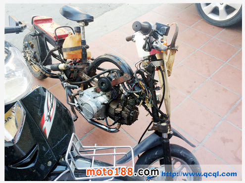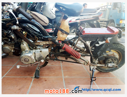 一部來自街頭的作品,搭載了一副 Honda Cub 50 的臥式發(fā)動機,踏板車/迷你車的 10 英寸前、后車輪,前鼓后碟的制動系統(tǒng),渦輪狀的空氣濾清器,Honda Scoopy 踏板車的儀表板,“ 炸街 ” 級的排汽管,“ 不對稱 ” 的后雙筒減震器,自行車的 “ 標配 ” 鞍座,隨意可見縫縫補補的主車架和后擺臂,制作者似乎把身邊能拿來一用的所有物品都往這車上糊 ...而車頭的一對羊角,卻也仿佛是有意無意凸顯了作坊附近的環(huán)境。