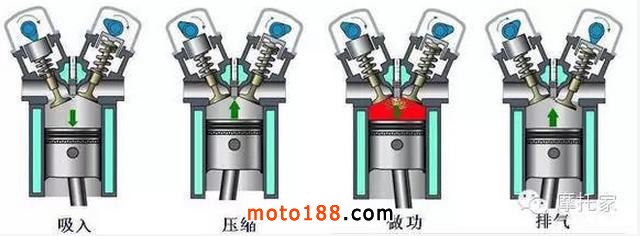 首先,想要搞懂發動機的區別,我們首先得明白四沖程發動機的工作原理,四沖程發動機工作步驟是:吸氣 壓縮 做功 排氣 四個沖程。