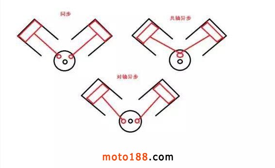 實際上所謂的雙缸同步發動機也是異步點火的,一個循環下 也是兩次點火因為四沖程發動機是 一共會運行兩圈才做工一次,兩個活塞正好可以在保持同步運動狀態(即 活塞 同時上升 同時下降)。