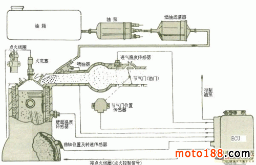 油泵為發動機提供充足的燃油量,并且保持足夠的油壓,使得在所有的工況下噴油器都能夠進行有效的燃油噴射。調壓器保持油管內的常壓,這樣就可以通過改變噴油器的開啟和結束時間來精確計量燃油量。點火鑰匙接通電源時,電控系統就開啟油泵,提供第一次噴射所需的燃油壓力。只要點火鑰匙接通電源且發動機運轉著,油泵就始終運轉工作。