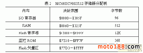 MC68HC908SR12可尋址64KB地址空間,主要包括:12KB的閃速存儲器Flash、512字節的隨機存儲器RAM、48字節的用戶定義矢量區和368字節的監控ROM,存儲器的具體分配情況如下表: