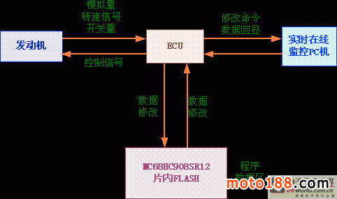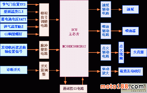 本次參賽采用摩托羅拉公司新推出的高性能價格比的MC68HC908SR12單片機,對原電子控制單元(ECU)的軟硬件進一步優化,降低成本,使其能夠參與激烈的市場競爭。