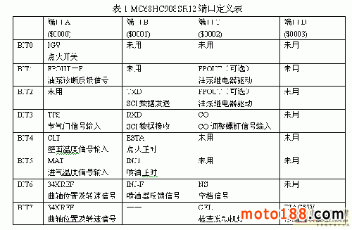由于摩托車發動機轉速高達上萬轉,點火提前角的計算必須在目標點火時刻到來之前完成,這時間通常不到0.5ms,所以需要較高的指令的執行速度。而且執行速度越快,ECU就可以獲取更新的傳感器信號,計算實現更精確的控制。MC68HC908SR12采用了PLL鎖相環技術,因此可以在很低的晶振頻率32.768KHz下,產生高達8M的總線頻率。本電控系統采用的內部總線為4.9125M,不僅滿足了摩托車發動機控制的需要,還可以產生19200的SCI通訊波特率,與原有的電控系統開發裝置兼容。 電控系統需要能采集5路A/D,并且具有1路輸入捕捉、2路輸出比較功能及各種I/O口,還要具有通訊接口。MC68HC908SR12具有4路輸入捕捉/輸出比較、12通道10位A/D轉化器和SCI串行通訊口,3個8位I/O口和1個7位I/O口(包括與其它功能模塊復用的端口),能滿足控制要求。各端口的使用狀況如下表1所示。