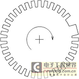轉速處理模塊的軟件示意框圖如圖4所示。轉速脈沖信號是由發動機曲軸位置及轉速傳感器獲得的,由于傳感器的觸發盤(如圖5所示)有一個不同于其它的大齒,因此,觸發盤轉動一周所產生的脈沖信號中也存在一個寬度較大的脈沖。利用這一點,將此脈沖信號經過軟件的處理之后,不僅可以用來提供發動機工況所需的轉速,還將提供電控系統工作所需的曲軸位置信息,從而按照發動機時序控制的要求在確定的曲軸轉角處實現點火和噴油輸出。