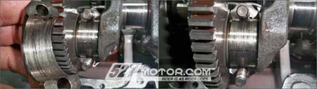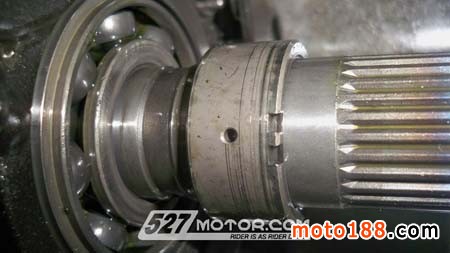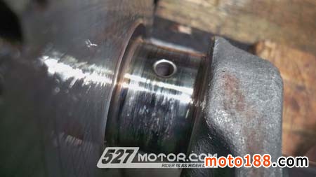 這是離合器外部的傳動軸,可以看到這上面有些垂直的線條,這些線條原本不應該出現在上面,表面應該是沒有任何磨痕的,不過由于使用了品質不良的機油,機油中帶有雜志,因此透過中間出油孔流出時,雜志直接附著在上面,因此產生了嚴重的摩擦。