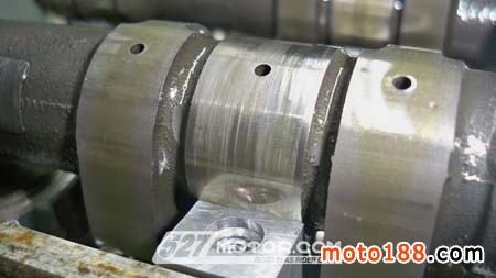 這張是在曲軸上所拍下的照片,可以看到也是出現很嚴重的磨損,也是因為機油潤滑不足,讓金屬直接摩擦所致。