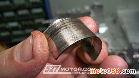 這兩張圖是一個更詭異的現象,原本在連桿與曲軸固定的地方,還會有一個小瓦片,不過當拆開這個引擎時,卻發現內側完全沒有瓦片!而是連桿的下固定組件直接與曲軸連接。有可能是機油潤滑不夠,讓這個厚度極薄的瓦片完全磨光了,因此造成破裂的金屬小碎片開始在引擎內部任意的流竄,而在沒有瓦片的緩沖加上油膜的潤滑,因此連桿下固定組件就成了這個模樣。