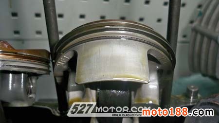 這是一輛有些年份的CB400,可以看到在活塞的側面有兩個不同的顏色,中間顏色比較淺的部位,是因為引擎尚未達到正常的工作溫度,由于活塞本身的是并非是真圓,因此需要等達到工作溫度時,藉由熱脹冷縮的效益,才會達到真圓!而在冷車時,很多人都會耍帥的轟油門,長期下來就是造成這個異常磨損的現象。