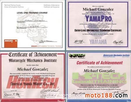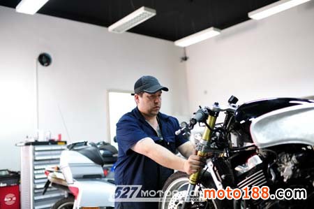 接下來我們采訪了北京摩德威美技師Michael,Michael本身具備Yamaha、Kawasaki、Honda、Ducati等專業維修資格證書,并且擁有多年賽隊車輛調校的經驗,先后在香港、珠海、臺北等地區擔任車隊技術總監,幫賽隊、大排量摩托進行賽前的車輛整備、改裝與懸吊設定等,而今則來到北京替摩德威效力,提供車友最專業的車輛調校與整備工作。