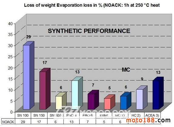 而來(lái)自瑞士的Motorex,在250度的高溫環(huán)境下,持續(xù)運(yùn)轉(zhuǎn)1小時(shí),驗(yàn)證機(jī)油在這樣的環(huán)境下會(huì)損失多少機(jī)油量。經(jīng)過(guò)一小時(shí)的測(cè)試,經(jīng)由SN100提煉法的礦物油,燒機(jī)油現(xiàn)象達(dá)到29%,而采用PAO與Ester等提煉方式的基礎(chǔ)油,僅損失7%、5%,因此可比較出礦物油與”真正”全合成機(jī)油的差異性。