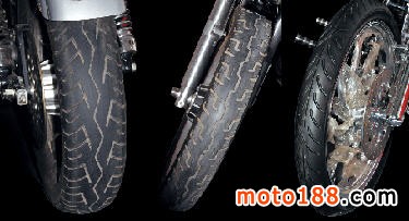 我們常用的輪胎基本是BRIDGESTONE “石橋”(日本),DUNLOP“登祿普”(美國),METZELER“象”(德國),PIRLELLI “倍耐力”(意大利),MICHELIN“米其林”(法國),AVON“雅芳”(英國),還有一些特殊的牌子:MAXXIS“正新瑪吉斯”,IRC“井上”(日本), COKER(美國),CONTINENTAL“大陸”(美國),VEE RUBBER(泰國)。這些品牌很多朋友都知道,我來簡單介紹一下:BRIDGESTONE“石橋”和DUNLOP“登祿普”還有PIRLELLI“倍耐力”,MICHELIN“米其林”是摩托車輪胎業的四大巨頭,他們的輪胎占有了80%以上的市場。AVON“雅芳”是英國的輪胎,主要是生產改裝巡航車的輪胎,一般都是大尺寸比較出名。泰國的VEE RUBBER 是極少的另類產品的制造商。COKER(美國),CONTINENTAL大陸(美國)主要是生產一些復古老車的輪胎。其中IRC等一些牌子還是ATV和自行車輪胎的制造廠家。對于巡航車來說,使用的輪胎一般都是著重于耐磨性和載重性,對于性能并不是特別注重,不過我們可以更換成比較運動的型號,AVON和METZELER都是不錯的選擇,當然了我們也可以使用價格實惠又便宜的BRIDGESTONE,就是相同載重下耐磨性不好。對于巡航車來說,DUNLOP是不錯的選擇,BRIDGESTONE是最廣泛地選擇,對于改裝來說,AVON則是最佳的選擇。