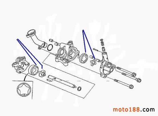 機油泵的作用是吸進并泵送機油,從而滿足發動機各部分潤滑的需要,對于V4發動機的機油泵來說,它是曲軸通過動力傳輸齒輪傳遞給離合器大鼓,再由大鼓背部的一個鏈盤通過鏈條傳遞給機油泵驅動鏈盤來驅動機油泵的。其中機油泵的內轉子采用的是四個齒,外轉子比內轉子多一個齒,內外轉子偏心布置,從而使每個齒的前后壁面得以密封,轉子工作時,利用轉子之間的容積變化來泵送機油。由于轉子的齒形是次擺線,所以又叫次擺線齒輪泵。這種機油泵的供油量和供油壓力取決于轉子直徑,轉子整體厚度和轉速這三個參數。