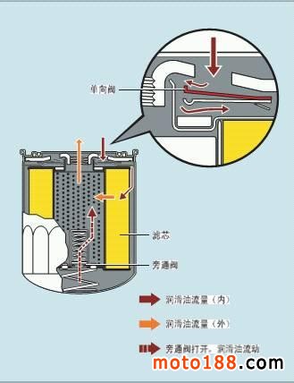 當機油濾清器內部的濾芯堵塞時,則濾芯內側與外側就會產生壓差,這個壓差會隨著堵塞狀況的加大而加大,當壓差達到或超過規定值時,這時旁通閥打開把沒有經過濾清器過濾的機油直接輸送給潤滑點,從而保證最低限度的潤滑。這樣雖然防止了因為濾芯堵塞而造成的潤滑不良,但送入主油道的機油是臟機油。時機油濾清器可以對機油中的小顆粒異物進行過濾,但沒有自動清除異物的功能,長期使用會導致濾清器堵塞。所以濾清器是一種易耗品,需要定期更換。