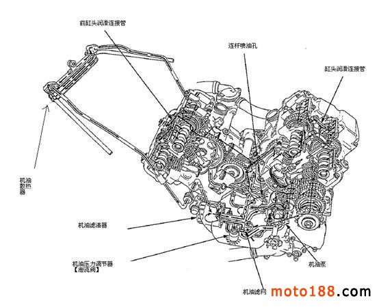 下面我們以VFR400 (NC24)為例,對潤滑系統進行講解,該車的潤滑系統結構如圖8所示。