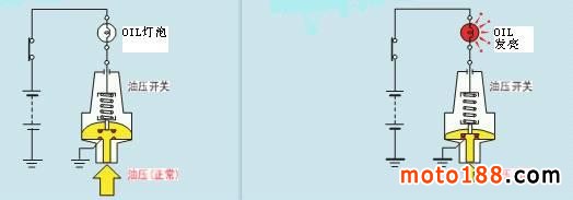 在VFR系列的儀表上有一個OIL燈,這個燈在鑰匙打開時發亮,發動機啟動后熄滅(雅馬哈的某些車型如FZR250的潤滑系統使用的是重力開關,打開點火開關OIL燈不亮,啟動按鈕按下才發亮,曲軸箱內機油偏少才發亮,它們的控制方式不同)。圖4是雅馬哈FZR250RR的機油重力開關。