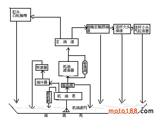 對于多缸四沖程軸瓦結構摩托車來說,由于曲軸與連桿使用的是高速軸承,而高速軸承對潤滑油的供油壓力與潔凈度有嚴格要求,所以它們的潤滑系統與一般普通小排量車不同。潤滑系統如圖1所示。