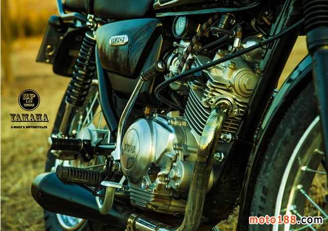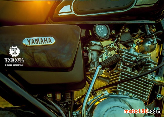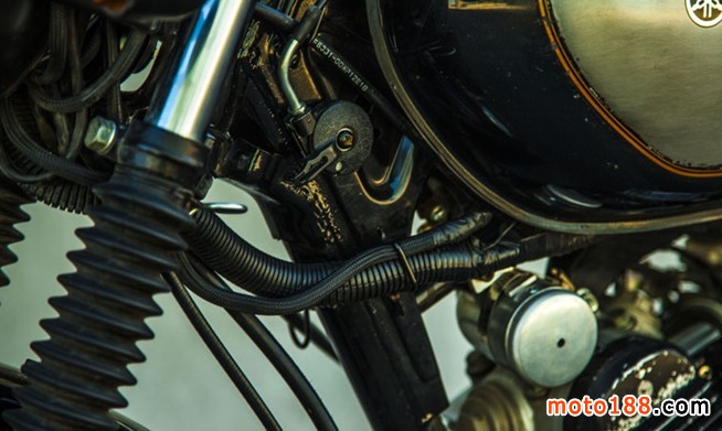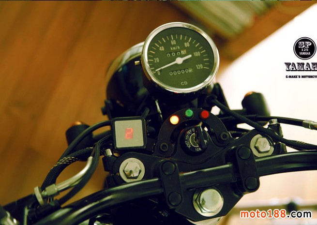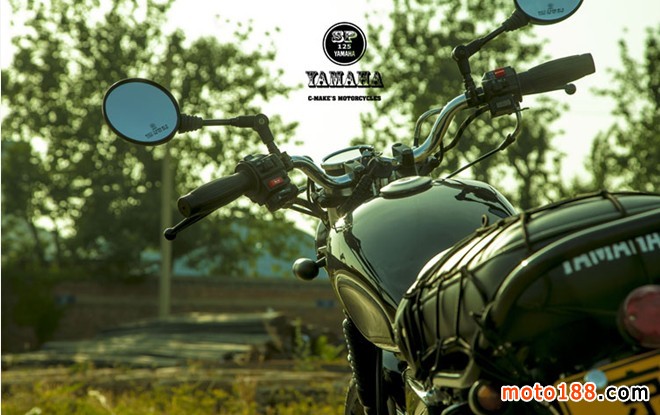 換成SR250油箱,調(diào)整了自制的小鏈邊蓋,更換車把和車把開關(guān),