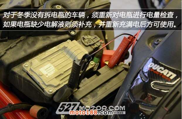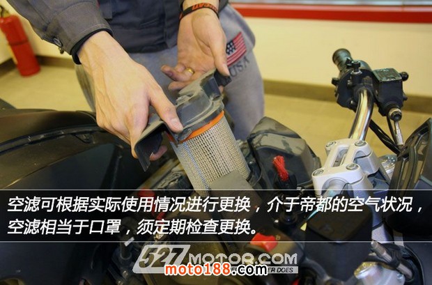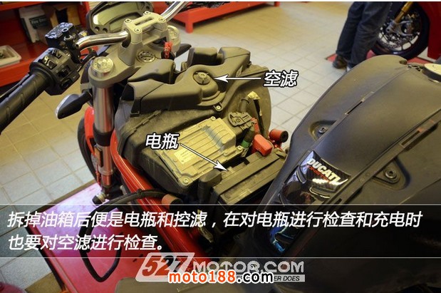 對于冬季封車的朋友來說,拆掉電瓶充電是較為穩(wěn)妥的保養(yǎng)方式,因此騎車前須將電瓶重新裝回,而Monster 795的電瓶位于油箱下方,要想裝回必須拆掉油箱,所以在拆裝的過程可以同步檢查空氣濾清器。
