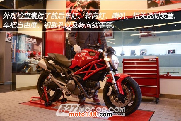 杜卡迪Monster 795專門針對亞洲人的身材進(jìn)行設(shè)計,而且作為入門級車款它在國內(nèi)的保有量和關(guān)注度都相對較高,因此本次春季保養(yǎng)我們以Monster 795為例進(jìn)行操作。本次保養(yǎng)檢查共計15項,我們大致將其分為:外觀系、制動系、動力系以及其它四個部分。