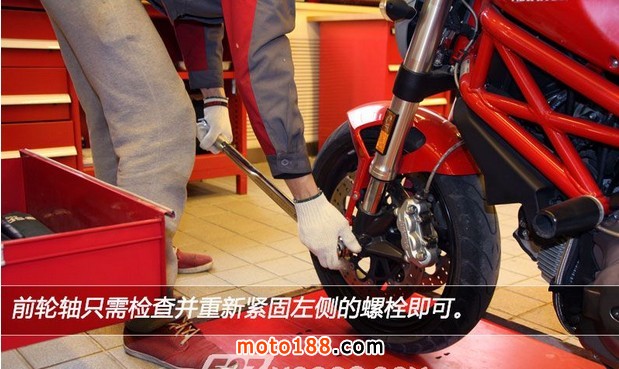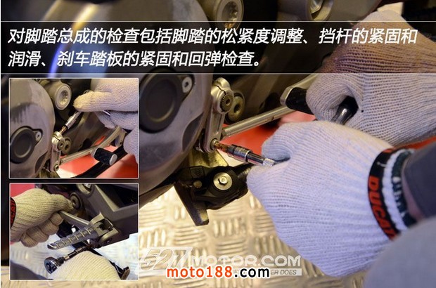 除了上述組件的檢查外,檢查外觀時還須對腳踏總成以及前后輪軸的緊固程度進(jìn)行檢查。首先是對腳踏總成的檢查,它包括腳踏的松緊度調(diào)整、擋桿的緊固和潤滑、剎車踏板的緊固和回彈檢查。檢查完腳踏總成后便是對前后輪軸的緊固程度進(jìn)行檢查,由于Monster 795采用雙搖臂設(shè)計,所以后輪兩側(cè)均需重新緊固,而前輪只需檢查左側(cè)的螺栓即可,檢查時必須使用專用的力矩扳手對其緊固,如果使用普通扳手很難達(dá)到規(guī)定的力矩,過松容易出現(xiàn)螺栓松動,嚴(yán)重的時候車輪都有可能跑出來,過緊則容易損壞螺栓并且會加速相關(guān)零件的老化。