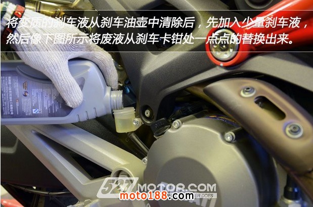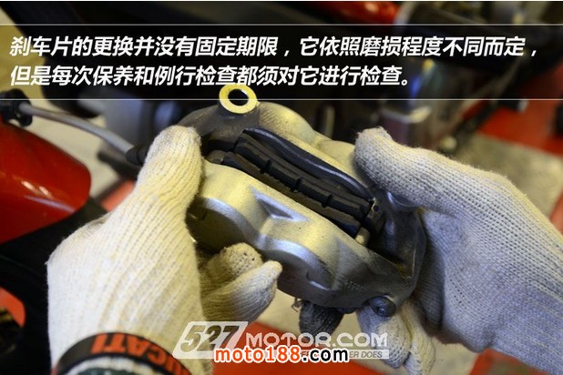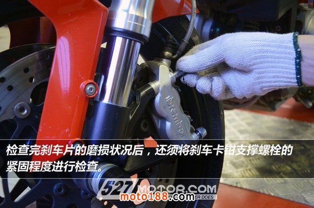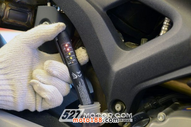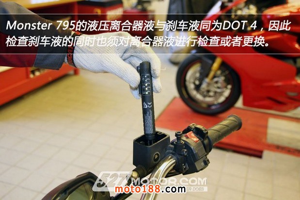 外觀檢查完后便是對制動系統(tǒng)的檢查,由于Monster 795的液壓離合器液與剎車液同為DOT 4,因此在檢查制動剎車液的同時也須對離合器液進(jìn)行檢查,檢查的主要指標(biāo)是剎車液中的含水量是否超標(biāo),如果含水量超標(biāo),會引起剎車液的變質(zhì),從而影響整體的剎車表現(xiàn)。檢查完剎車制動液和離合器液后便是對剎車片的磨損程度進(jìn)行檢查,剎車片的更換并沒有固定期限,它依照磨損程度不同而定,但是每次例行檢查都必須對它進(jìn)行檢查。