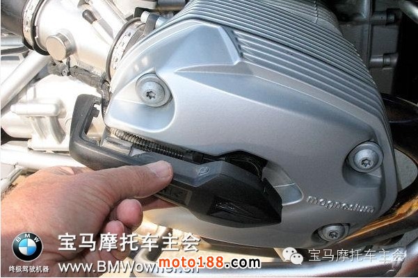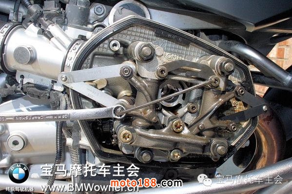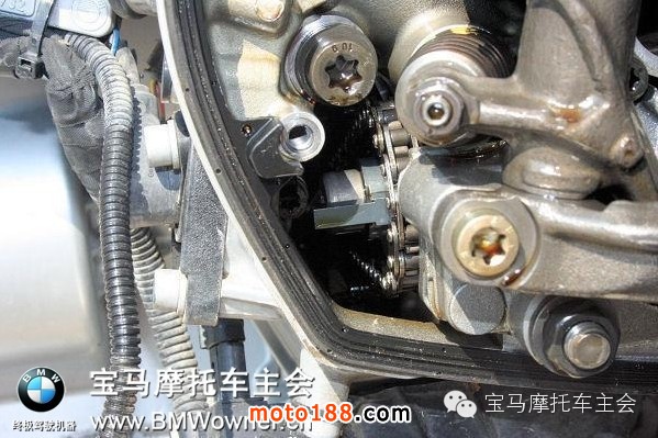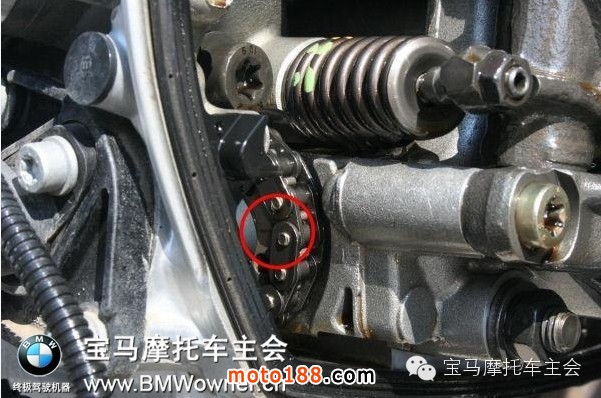 把車子掛上6檔,用手轉(zhuǎn)動后輪使右汽缸到達上止點。怎么判斷到達上止點了呢?留意上圖紅圈位置,鏈輪上有個小箭頭,正好朝外跟火花塞位置相同了,這就是了。如果這時候進氣門和排氣門沒有同時被搖臂釋放,那就繼續(xù)旋轉(zhuǎn)后輪,同時觀察鏈輪上的上止點箭頭,直到箭頭在一次到達剛才提及的位置。這個時候氣門就應(yīng)該被釋放了。