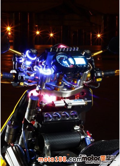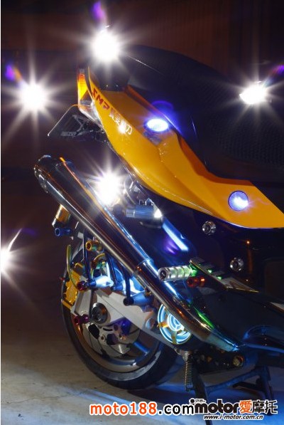 Tuner將此臺(tái)G-Max植入全套Car Audio器材,不但在騎乘時(shí)自己可以聆聽的過癮,旁人也能一并享受,讓聽覺有無比震撼的節(jié)奏感,并透過燈光改在喇叭頭加裝CCFL冷陰極管,搭配震波接收器,即使是在暗黑深處,也能發(fā)出爆閃冷光,絕對(duì)可令人轉(zhuǎn)頭觀看,得到多方的感官刺激:重低音效果更是必備,由腹內(nèi)的射出音壓沒有方向性限制,可是擁有轟炸街頭的實(shí)力,并由車體后方可直接看到外蓋造型獨(dú)特的毒蜘蛛低音炮!連同首見的Ohlins雙后連桿阻尼棒,也是為了兼顧音響改裝的制震裝置,讓車輛震動(dòng)產(chǎn)生的雜音與敲擊情況降到最低,更可環(huán)顧車輛改裝品與行車穩(wěn)定性。