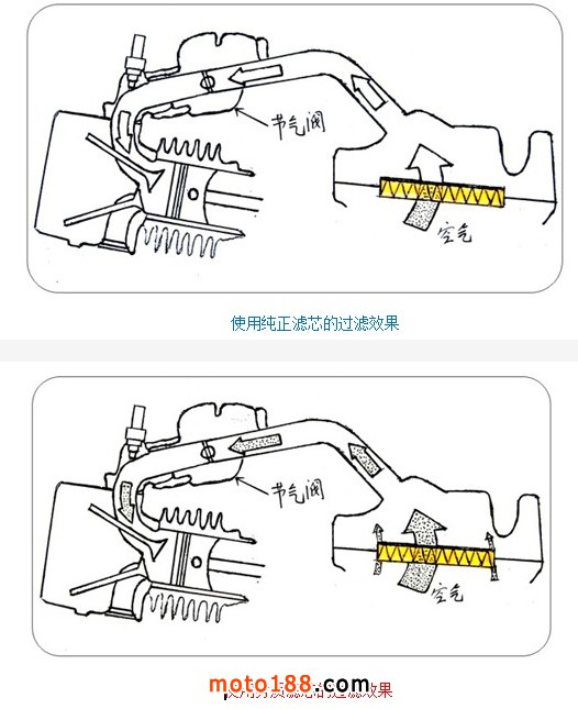 2.劣質(zhì)空氣濾芯器,其濾紙容易被灰塵在較短的時間內(nèi)堵塞,濾紙的透氣性很快就變差,且劣質(zhì)空氣濾芯器普遍濾紙“皺褶”較少,過濾面積小,因此無法讓空氣順暢進入發(fā)動機燃燒室,導(dǎo)致發(fā)動機進氣不足,發(fā)動機動力下降,油耗增大。