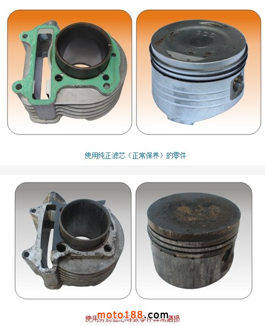1.劣質(zhì)空氣濾芯器一方面濾紙材質(zhì)粗糙,過濾性能差,不能有效阻止空氣中的灰塵進入燃燒室;另一方面其外形尺寸與安裝殼體之間容易出現(xiàn)空隙,導(dǎo)致部分空氣未經(jīng)過濾就進入燃燒室。灰塵進入燃燒室,導(dǎo)致氣缸體、活塞、活塞環(huán)等發(fā)動機零件異常磨損,從而導(dǎo)致發(fā)動機出現(xiàn)燒機油現(xiàn)象。