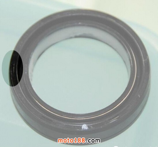 新油封拿在手里一看,麻煩了,不知道正反面。仔細(xì)一看上邊是有個(gè)小槽子標(biāo)記。然后我找到舊油封一看,有同樣的標(biāo)記。那就好辦了。原來是槽子朝上的,新油封按照這個(gè)方向放進(jìn)去: