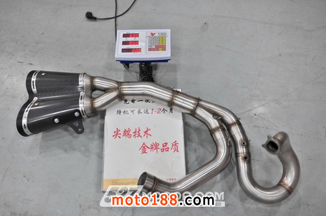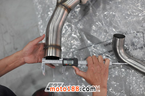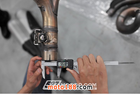無論是改裝排氣還是原廠排氣,都是采用2-1-2的方式設計,不過在排氣的管徑上則有些為的差異。Termignoni在頭段、中段的排氣口徑,基本上與原廠排氣并無太大差異。原廠排氣在頭段的前、后缸的的口徑分別為--mm/55mm(第一缸的出口因為是扁口所以無法進行量測)、58mm/55mm,而Termignoni的前段口徑則為--mm/54mm、58mm/54mm。在中段的部份,前后兩缸匯集在一起,原廠口徑為58mm/55mm,而Termignoni口徑為57mm/68mm。而在尾段方面,Termignoni排氣僅為原廠排氣的1/3,可想而知Termignoni內管并沒有太多回壓的阻力與隔板,幾乎為直通管!在口徑方面,原廠管口徑僅為58mm,Termignoni改裝口徑則達到了70mm。
