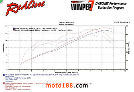 原廠意大利版Ducati Diavel所拉出的輪上馬力為134.88hp,而換過Termignoni全段鈦合金排氣、競技用ECU電腦、空濾之后,所得的最大馬力為143.46hp,整體提升達(dá)到8.58hp。加上輕量化的結(jié)果,效果是可想而知!然后面對泰國產(chǎn)Diavel閹割版的110hp車款,想要得到更好的性能,更換改裝排氣才是王道。而對于高音爆排氣聲浪感到厭惡的車主,則可以考慮換上原廠意大利版排氣與電腦,依舊可以得到相同的滿足。