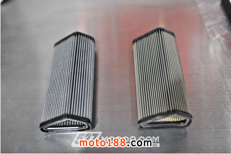 左邊為Termignoni所配置的高流量空濾,右側(cè)為Ducati原廠所提供的空濾,其實(shí)原廠Ducati所配置的空濾,已經(jīng)算是相當(dāng)大流量的空濾,但仔細(xì)觀察不難看出Termignoni還在內(nèi)層過濾網(wǎng)上,增加更多細(xì)網(wǎng)目鐵絲取代原廠的濾綿設(shè)計,增加進(jìn)氣流量。