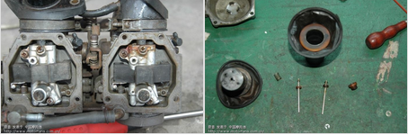 拆開一看,膜穿孔了,油針卡簧還少一個,用個鐵絲卡在上面,混合氣絲還是擰不動,哪個孔又很深,也看不到里面的狀態(tài)。
