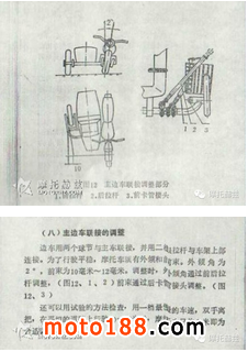 邊車用兩個(gè)球節(jié)與主車連接,并用兩根拉桿與主架上部連接。為了行駛平穩(wěn),摩托車須有外傾和前束。外傾角為2度,前束為10毫米至12毫米。調(diào)整時(shí),外傾角通過(guò)前后拉桿調(diào)整,(圖1、2)前束通過(guò)后卡管接頭調(diào)整(圖3)。