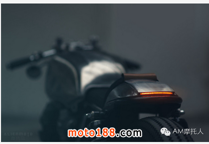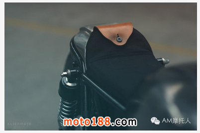 此外,手工打造的棕色皮革混搭14盎司牛仔單寧的座椅,復(fù)古范十足。制作時(shí)加入了多層防水蠟涂層,更甚的是還有一個(gè)隱藏的小口袋在后面,可以放一些小東西,皆具實(shí)用性和設(shè)計(jì)感。值得一提的還有專門制作的頭燈蒙罩。同樣是由真皮和單寧制作,前方留有矩形開口。點(diǎn)亮?xí)r,開口縫隙射出一道被塑形過(guò)的光源,猶如獨(dú)眼巨獸的惡魔之眼,超級(jí)有型,據(jù)說(shuō)靈感來(lái)自BMW的 Zündapps。如此討巧有創(chuàng)意的設(shè)計(jì)非常值得借鑒。