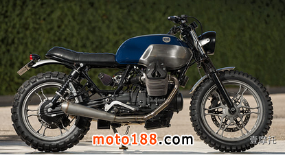 CAFE RACER DREAMS:是的這家來自西班牙的改裝廠就是這個名,但是卻帶著這輛v7走向了scrambler 風格,短小的精悍的車身,噴砂的輪轂亞光處理搭配豆胎,將電池盒移到了搖臂下,去掉邊板露出k&n空濾,排氣也針對大流量空濾定制,去掉了cafe的經典元素座包后改裝了后段車架換上平座,看起來是不是也別有一番風味?