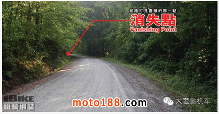 「消 失點Vanishing Point」又名「Limit point」或「Arrow Head」,是前路左右路肩線交疊在一起的那一點,也代表著前路視野盡頭,或引領著前進方向的箭頭。憑著對Vanishing point的觀察,我們可以令陌生彎道上的車速更平均,減少不必要的減速,和把握時機打開油門。