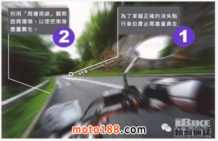 一如上圖所示,我們在轉左彎時需要周邊視野的情況也許不太明顯。但在轉右彎時,跑外側要貼住左邊路肩,還要提防路肩旁是否有沙石積水,這時候周邊視野的運用便顯得很重要。